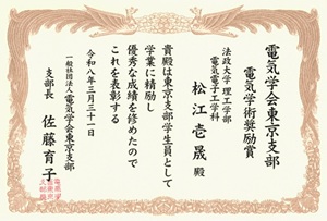 受 賞 名 : 令和7年度電気学会東京支部電気学術奨励賞